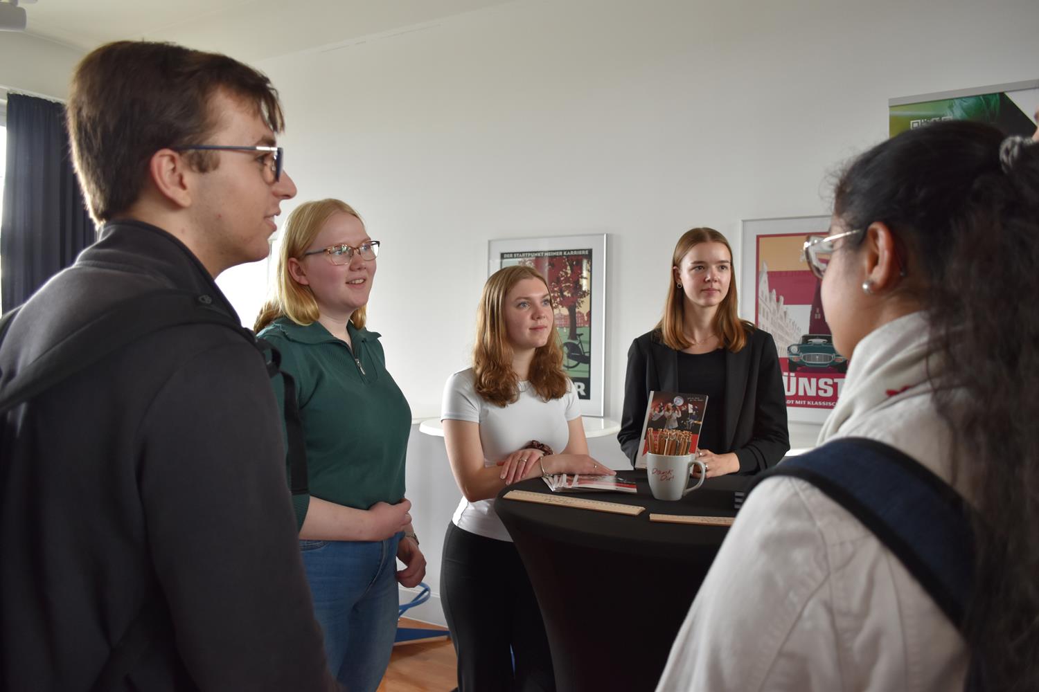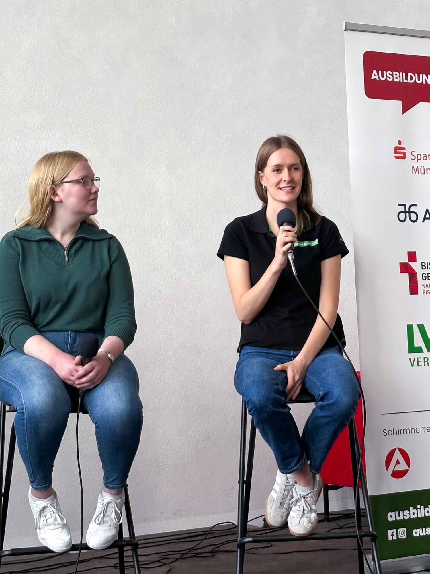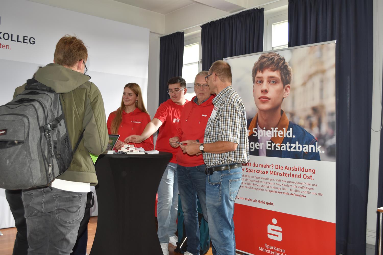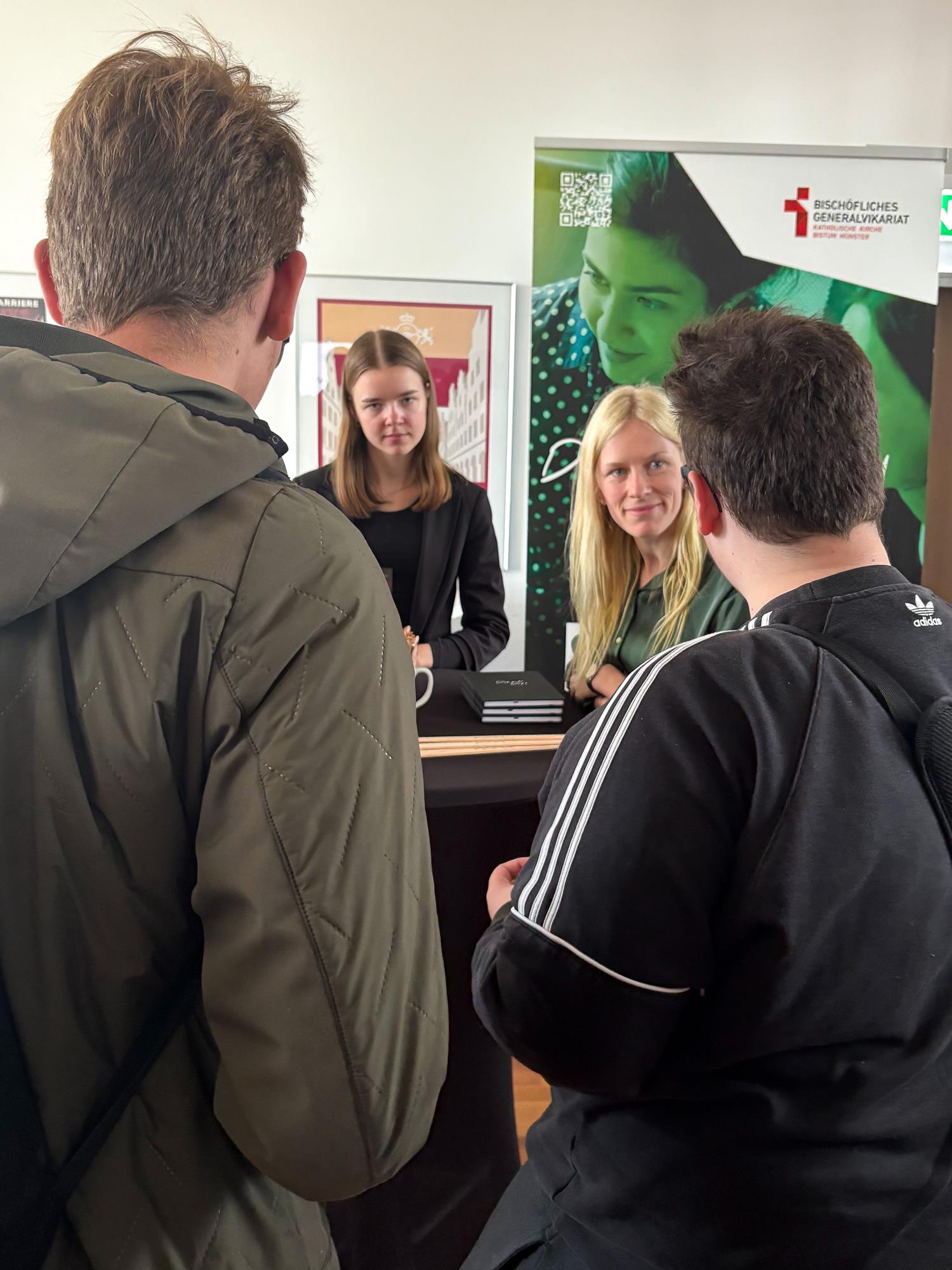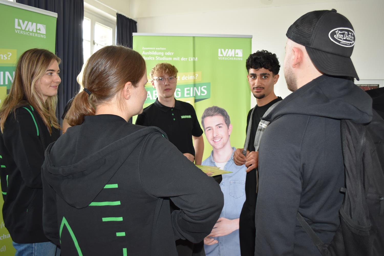 In einer interaktiven Berufsorientierungs-Talkshow berichteten Auszubildende der Firma Atruvia, der Sparkasse, der LVM und des Bischöflichen Generalvikariats über ihren typischen Azubi-Alltag, ihre beruflichen Erfahrungen und Perspektiven. Anschließend hatten unsere Schüler*innen die Gelegenheit, direkt mit Dual-Studierenden, Auszubildenden und weiteren Mitarbeitenden der Unternehmen in Austausch zu treten. Ziel war es, den Schüler*innen die vielfältigen Möglichkeiten ihrer beruflichen Zukunft aufzuzeigen und sie bei ihrer persönlichen Studien- und Berufsorientierung zu unterstützen.